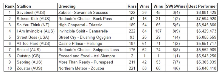 As expected, the winner of The Everest (Giga Kick) and Golden Eagle (I Wish I Win) have significantly increased the tally of Scissor Kick and Savabeel alongside the Melbourne Cup win of Gold Trip for Outstrip.
